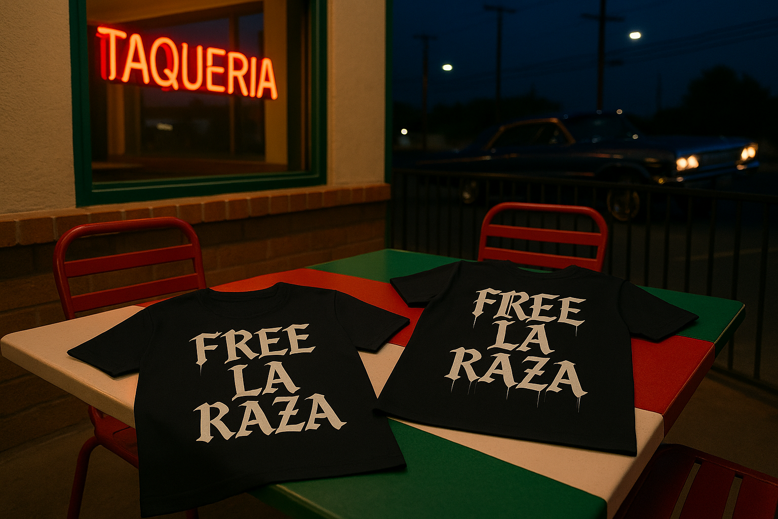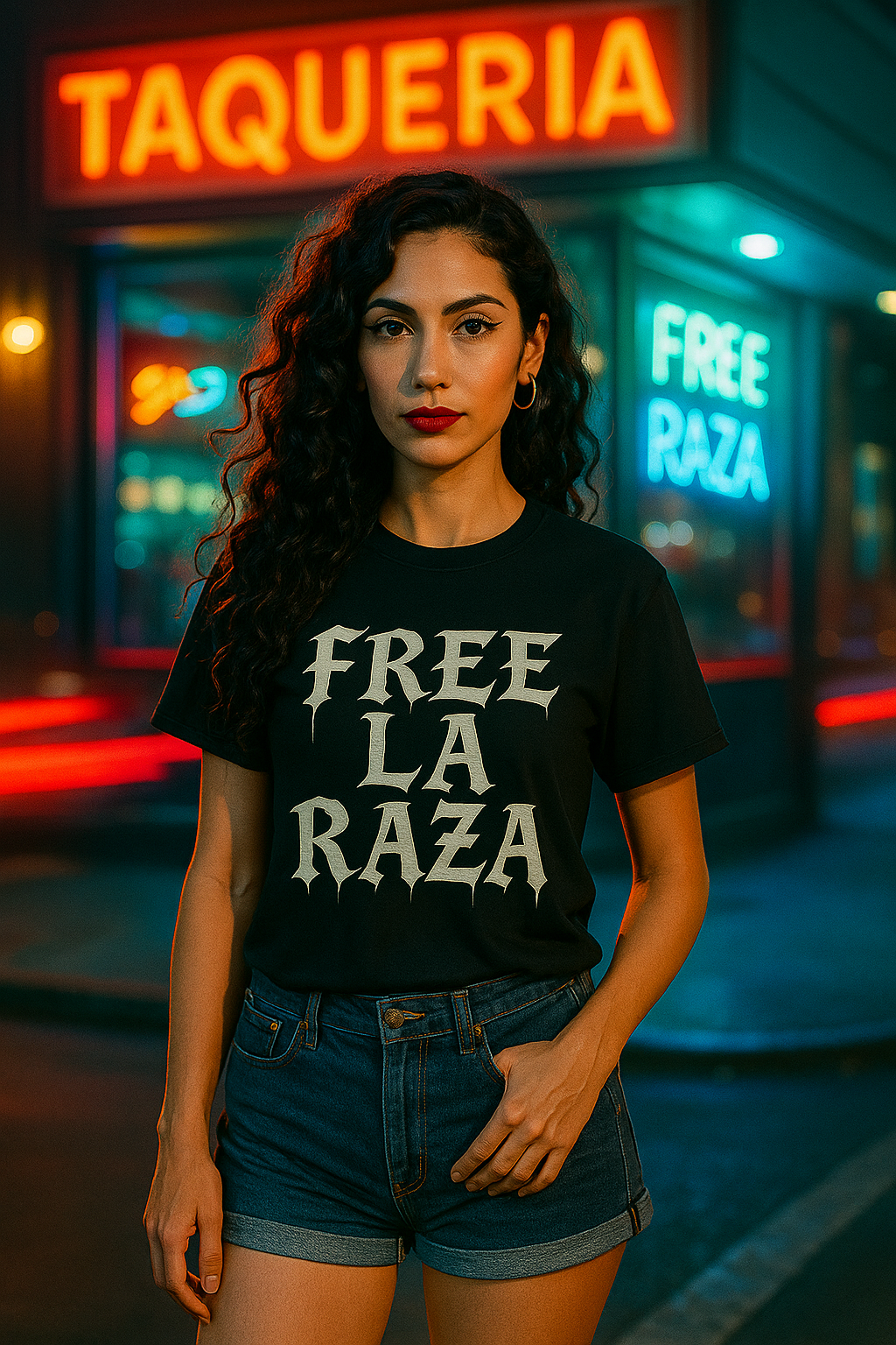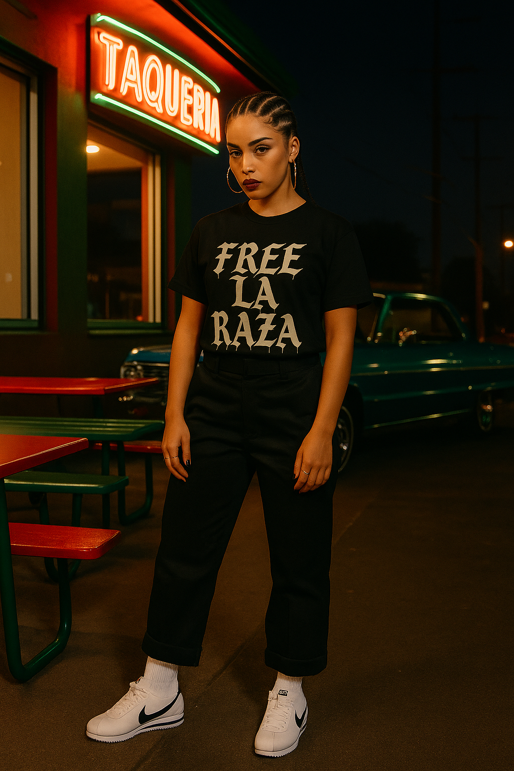This tee features the "Free La Raza" logo in Old English on both sides. It's a clear statement representing Chicano and Latino identity and resilience, acknowledging the fight against gentrification and the history of stolen land.