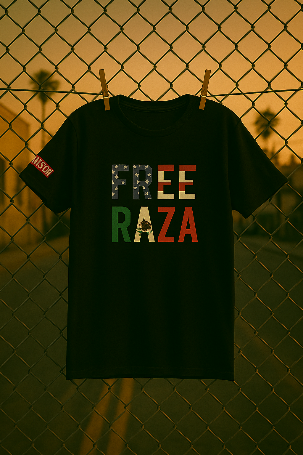 You didn’t cross the border the border crossed you. This tee holds the truth stitched in flags: FREE in stars and stripes. RAZA in tricolor orgullo. Because identity ain’t paperwork it’s culture, familia, barrio.